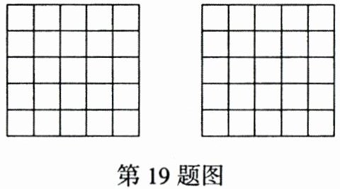 19. (2021陕西GDFZ)如图,有两个5×5的方格图,每个方格的面积为1,请你在方格图中,用涂阴影的方法,涂出两个不相同的图形,使这两个图形的面积都等于9,并且其中一个图形只有4条对称轴,另一个图形只有2条对称轴。