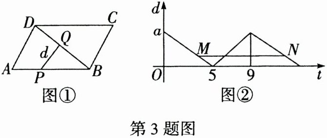 3. (2023 陕西 GXYZ 东校区改编)动点 P 在平行四边形 ABCD 边上沿着 A→B→C→D 的方向匀速移动,到达点 D 时停止移动。已知点 P 的速度为1个单位长度/秒,其所在位置用点 P 表示,点 P 到对角线 BD 的距离(即垂线段 PQ 的长)为 d 个单位长度,其中 d 与 t 的函数图象如图②所示。