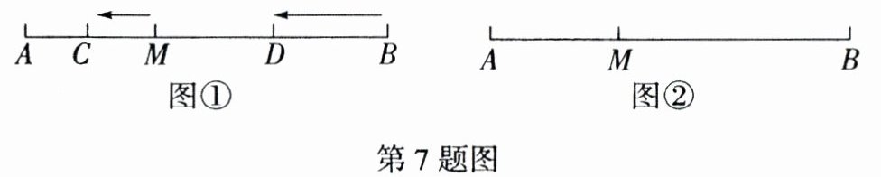 7. (2024 陕西 TYZ)已知如图①,M 是定长线段 AB 上一定点,C、D 两点分别从 M、B 出发以 1 cm/s、3 cm/s 的速度沿直线 BA 向左运动,运动方向如箭头所示。(C 在线段 AM 上,D 在线段 BM 上)