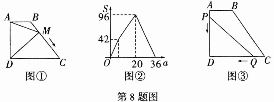 (1)动点 M 从 A 出发,以每秒 1 个单位的速度沿路线 A→B→C→D 运动到点 D 停止。设运动时间为 a,$△AMD$的面积为 S,S 关于 a 的关系图象如图②所示,求 AD,CD 的长。