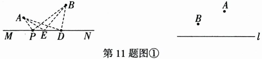 (1)如解图①,方法:作点B关于直线l的对称点B',连接AB'交l于点P,连接BP,则AP+BP=AB',由“两点之间,线段最短”可知,点P即为所求的点。