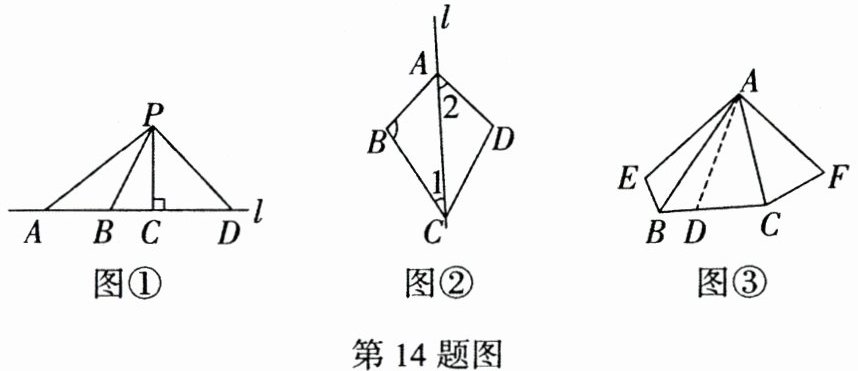 14. (2023陕西JDHT学校)【实践发现】(1)如图①,点P是直线l外一点,则线段PA、PB、PC中最短的线段是