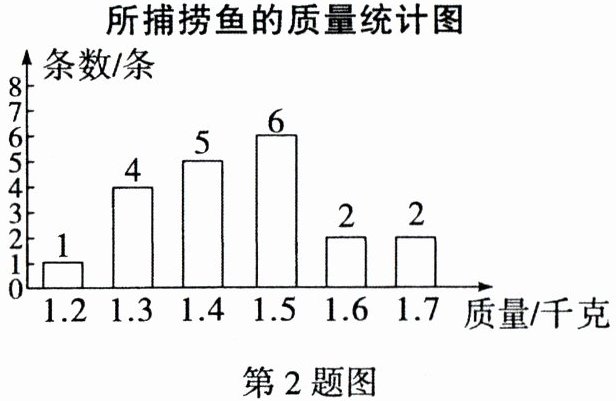 2. (2023 陕西 GX11C)王大伯承包了一个鱼塘,投放了 2000 条某种鱼苗,经过一段时间的精心喂养,存活率大致达到了 90%。他近期想出售鱼塘里的这种鱼。为了估计鱼塘里这种鱼的总质量,王大伯随机捕捞了20 条鱼,分别称得其质量后放回鱼塘。现将这 20 条鱼的质量作为样本,统计结果如图所示。