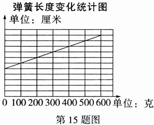 15. (2020 陕西 JDFZ)小明用一根弹簧做实验,测量并记录当弹簧上挂上不同重量的物品时弹簧的长度,并制作了如下的统计图。挂上500克物品时的弹簧长度比挂上300克物品时的弹簧长度长4厘米。