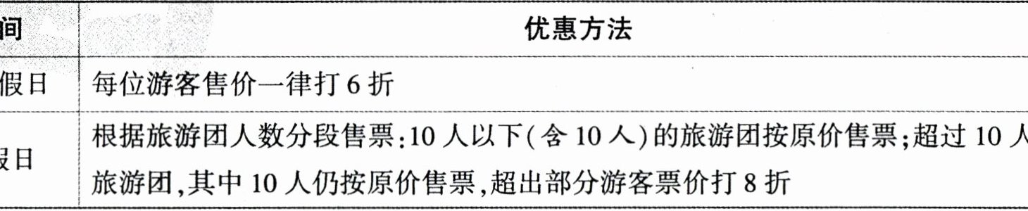 9. (2023 陕西 TYZ)某景区原定门票售价为50元/人,政府为发展旅游经济,该景区决定采取优惠售票方法吸引游客,优惠方法如表: