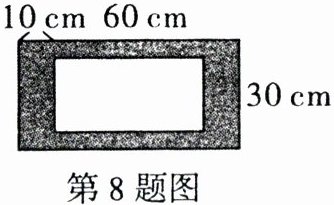 8. (2021 陕西 TYZBH 学校)在一个长 60 厘米,宽 30 厘米的长方形黑板上涂满白色。现有一块长 10厘米的长方形黑板擦,用它在黑板内紧紧沿着黑板的边擦黑板一周(黑板擦只做平移,不做旋转)。如果黑板上没有擦到的部分恰好是黑板面积的一半,那么这个黑板擦的宽是多少厘米?