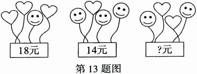13. (2024 陕西 CX4C)陈老师准备购置气球装扮学校"六一"儿童节活动会场,气球的种类有笑脸和爱心两种,两种气球的价格不同,但同一种气球的价格相同,由于会场布置需要,购置时以一束(4个气球)为单位,第一、二束气球的价格如图,那么第三束气球的价格为______元。