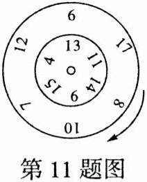 11. (2024 陕西 GXYZ)如图是一个金库门上的密码锁齿轮。现在外圈和内圈的6组数字之和是没有规律的。据说只有当6组数字之和都相等的时候,金库的大门才会打开,那么外圈的齿轮顺时针转动______格,才能打开金库的大门。