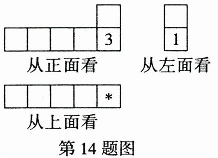 14. (2024 陕西 GX3C)骰子是6个面上分别写有数字1,2,3,4,5,6的小立方体,它任意两对面上所写的两个数字之和为7。将这样相同的几个骰子按照相接触的两个面上的数字的积为6摆成一个几何体,这个几何体的三视图如图所示。已知图中所标注的是能看到的面上的数字,则"*"代表的数字是______。