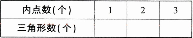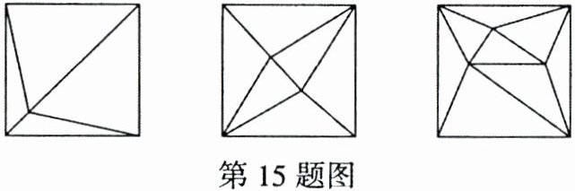 15. (2024 陕西 D3ZX)在一个正方形的纸板内有若干个点(称为内点),用这些内点和正方形的4个顶点为三角形的顶点,能画出多少个不重叠的三角形? 如图中分别画出了正方形内有1个内点、2个内点、3个内点的情形。