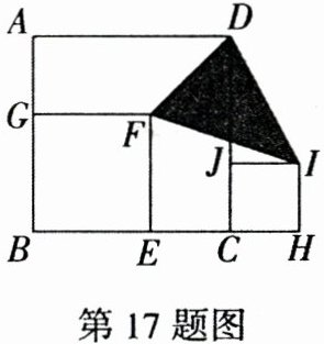 17. (2023 陕西 GXYCY 学校)如图,有三个正方形$ABCD$,$BEFG和CHIJ$,其中正方形$ABCD$的边长是10,正方形$BEFG$的边长是 6,求三角形$DFI$的面积。