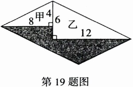 19. (2022 陕西 GX3C)如图,在一平行四边形纸片上割去了甲、乙两个直角三角形。已知甲三角形两条直角边分别为 4 厘米和 8 厘米,乙三角形两条直角边分别为 6 厘米和 12 厘米。求阴影部分的面积。