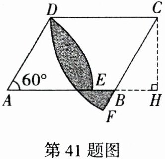 41. (2024 陕西 SDFZ)如图,在平行四边形$ABCD$中,$AD= BC= 6$厘米,$AB= CD= 8$厘米,高$CH= 5$厘米,$\angle DAB= \angle DCB= 60^\circ$,以点$A$为圆心,$AD为半径画弧交AB于点E$,以点$C$为圆心,$CD为半径画弧交CB的延长线于点F$,求图中阴影部分的面积。($\pi$取 3.14,结果保留一位小数)