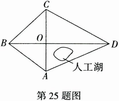 25. (2022陕西CXGJDFZ)如图,某公园的外轮廓是四边形 ABCD,被对角线 AC,BD 分成四个部分(AC,BD 不一定垂直)。△AOB 的面积是1平方千米,△BOC 的面积是2平方千米,△COD 的面积是3平方千米,公园陆地面积为6.92平方千米,那么人工湖的面积是多少平方千米?