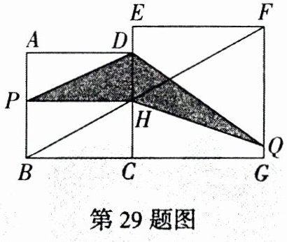 29. (2021陕西TYZ)边长分别为8 cm 和10 cm 的两个正方形 ABCD 和 CEFG 如图所示摆放在一起,连接 BF 交 CD 于点 H。现有两个动点 P 和 Q 分别在边 AB,FG 上运动,连接 PD,PH,QD,QH,问这四条线段围成的阴影部分的面积是否变化? 若变化,请说明理由;若不变,请求出阴影部分的面积。
