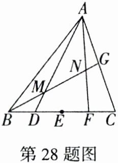 28. (2023陕西GDFZ)如图,在△ABC 中,G 是 AC 的中点,D,E,F 是 BC 边上的四等分点,AD 与 BG 交于点 M,AF 与 BG 交于点 N,已知△ABM 的面积比四边形 FCGN 的面积大6平方厘米,则△ABC 的面积是多少平方厘米?