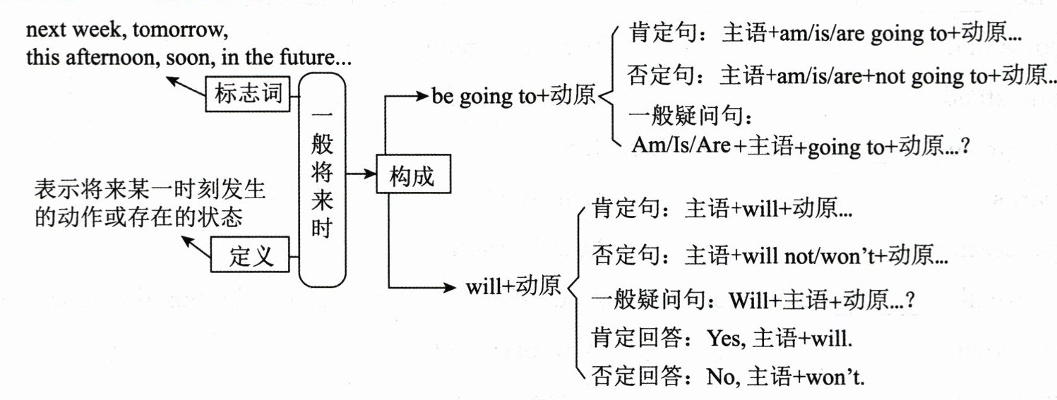 一般将来时的标志词有next week, tomorrow, this afternoon, soon, in the future等;定义为表示将来某一时刻发生的动作或存在的状态;构成有be going to + 动原(肯定句:主语 + am/is/are going to + 动原...;否定句:主语 + am/is/are + not going to + 动原...;一般疑问句:Am/Is/Are + 主语 + going to + 动原...?)和will + 动原(肯定句:主语 + will + 动原...;否定句:主语 + will not/won’t + 动原...;一般疑问句:Will + 主语 + 动原...?肯定回答:Yes, 主语 + will. 否定回答:No, 主语 + won’t. ) 。