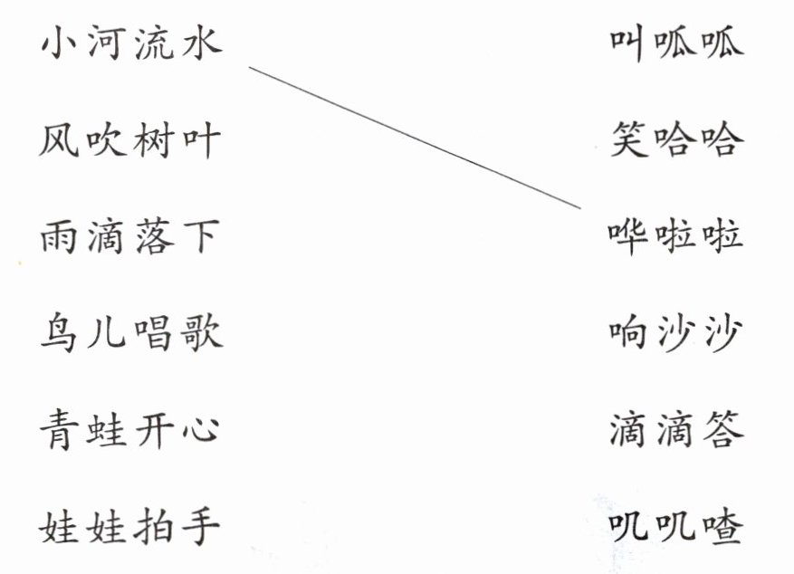 2. 小河流水——哗啦啦;风吹树叶——响沙沙;雨滴落下——滴滴答;鸟儿唱歌——叽叽喳;青蛙开心——叫呱呱;娃娃拍手——笑哈哈