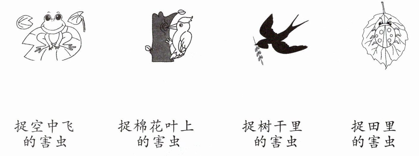 青蛙——捉田里的害虫;啄木鸟——捉树干里的害虫;燕子——捉空中飞的害虫;七星瓢虫——捉棉花叶上的害虫。