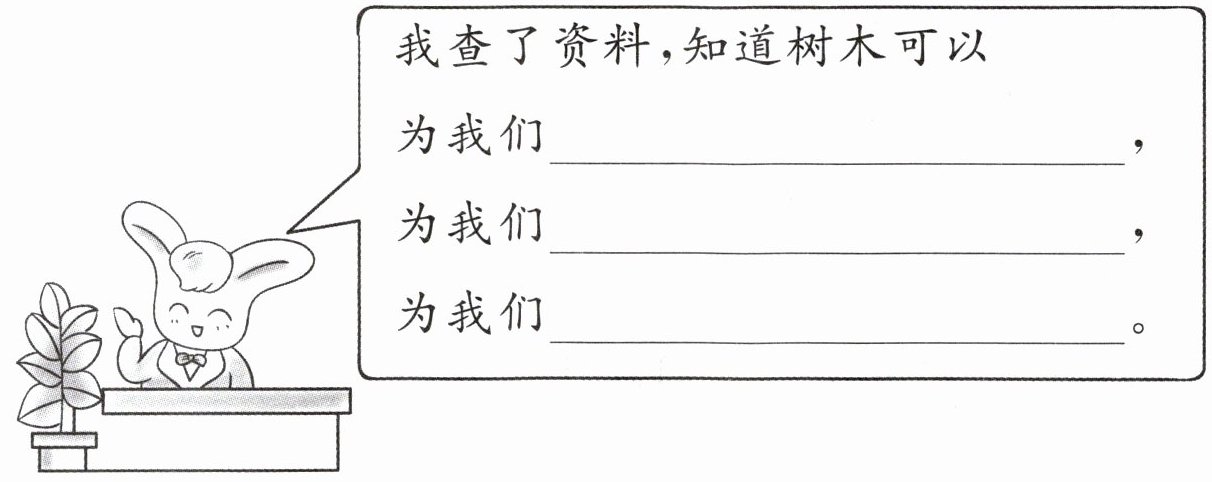 提供清新的空气;保持水土;建造房屋(答案不唯一,合理即可,例如“阻挡风沙”“制作家具”“提供果实”等)。