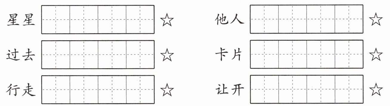 可以根据自己对书写规范和美观的理解,给写得好的字后面的☆涂色。比如如果觉得“星”“过”“走”“他”“片”“让”写得较好,就可以给这些字后面的☆涂色(涂色答案不唯一,根据实际书写判断)。