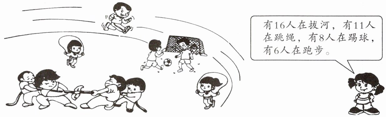 2. $16 - 8 = 8$,该式解决的是拔河的比踢球的多几人(或踢球的比拔河的少几人)的问题。