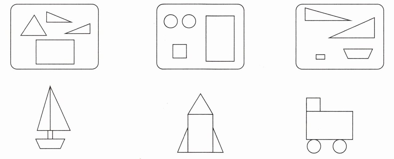 第一组图案与帆船相连,第二组图案与火箭相连,第三组图案与小车相连。