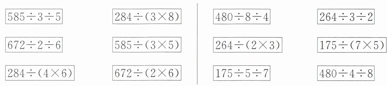 $\boxed{585÷ 3÷ 5}$ $\boxed{284÷ (3× 8)}$ $\boxed{480÷ 8÷ 4}$ $\boxed{264÷ 3÷ 2}$