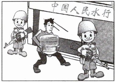 小朋友,请你仔细看看旁边的这幅漫画,什么时候出现“中国人民水行”了?难道水也需要“存”起来?说说漫画表达的意思和你的想法吧。