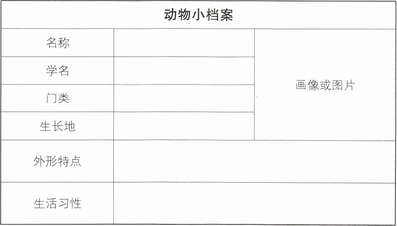 五、请你选择自己最喜欢的一种动物,通过观察和查阅资料,了解它的外形特点、生活习性等,并把下面这份“动物小档案”补充完整。