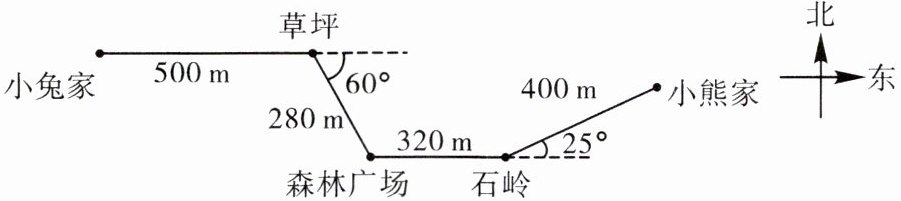 1. 如下图,小兔要到好朋友小熊家,它要先向()走()m到草坪,再向()偏()()°方向走()m到森林广场,接着向()走()m到石岭,最后向()偏()()°方向走()m到小熊家。