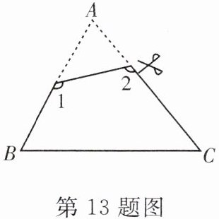 13. 如图,已知$\triangle ABC$中,$∠A= 40^{\circ }$,剪去$∠A$后变成一个四边形,则$∠1+∠2= $______.