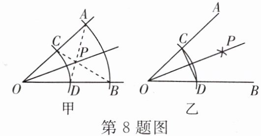 8.某班开展“用直尺和圆规作角平分线”的探究活动,甲、乙两位同学展示作图痕迹如图,其中射线OP为$∠AOB$平分线的是()