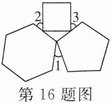 16. 如图,由正方形、正五边形和正六边形组合而成的图形中,$∠2 + ∠3 = 110^{\circ}$,则$∠1 = $______度。