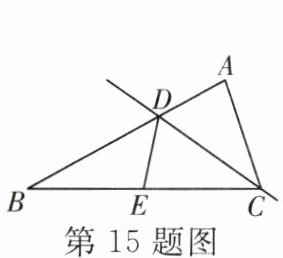 15. 如图,点$D为\triangle ABC的边AB$上一点,点$A关于直线CD的对称点E恰好在线段BC$上,连接$DE$. 若$AB = 9$,$AC = 4$,$BC = 10$,则$\triangle BDE$的周长是______.