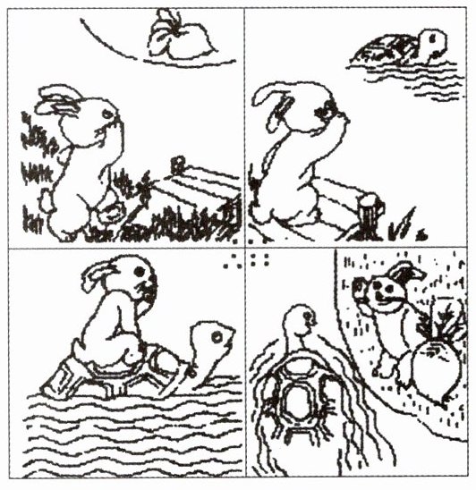 小白免看到乌龟哥哥在河里逍遥自在地玩要,就想到一个好办法,它对乌龟说:“乌龟哥哥您好,您可以把我送到对面的岸上去吗?”乌龟哥哥说:“好啊!”
