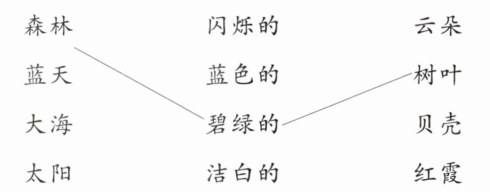 1. 森林—碧绿的—树叶;蓝天—洁白的—云朵;大海—蓝色的—贝壳;太阳—闪烁的—红霞