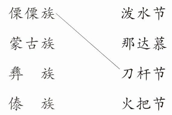 傈僳族—刀杆节;蒙古族—那达慕;彝族—火把节;傣族—泼水节;狗不理包子—天津;牛肉拉面—兰州;刀削面—山西;羊肉串—新疆