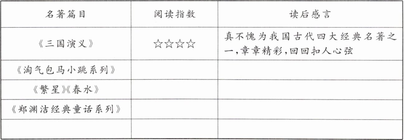 |名著篇目|阅读指数|读后感言||----|----|----||《三国演义》|☆☆☆☆|真不愧为我国古代四大经典名著之一,章章精彩,回回扣人心弦||《淘气包马小跳系列》|☆☆☆|充满了童真童趣,让人感受到童年的快乐和美好。||《繁星》《春水》|☆☆☆|文字清新淡雅,情感细腻,如潺潺溪流滋润心灵。||《郑渊洁经典童话系列》|☆☆☆|想象力丰富,故事有趣,陪伴了无数人的童年。|