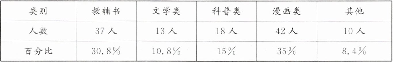 阅读是一场与心灵的对话。因此,找到适合学生读的课外书籍尤为重要。2018年5月,某学校对五年级120名学生进行了一次关于课外阅读的调查,部分统计如下: