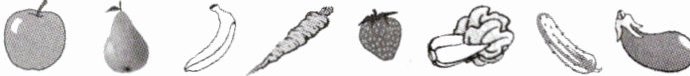 水果:苹果、梨、香蕉、草莓;蔬菜:胡萝卜、白菜、黄瓜、茄子。
