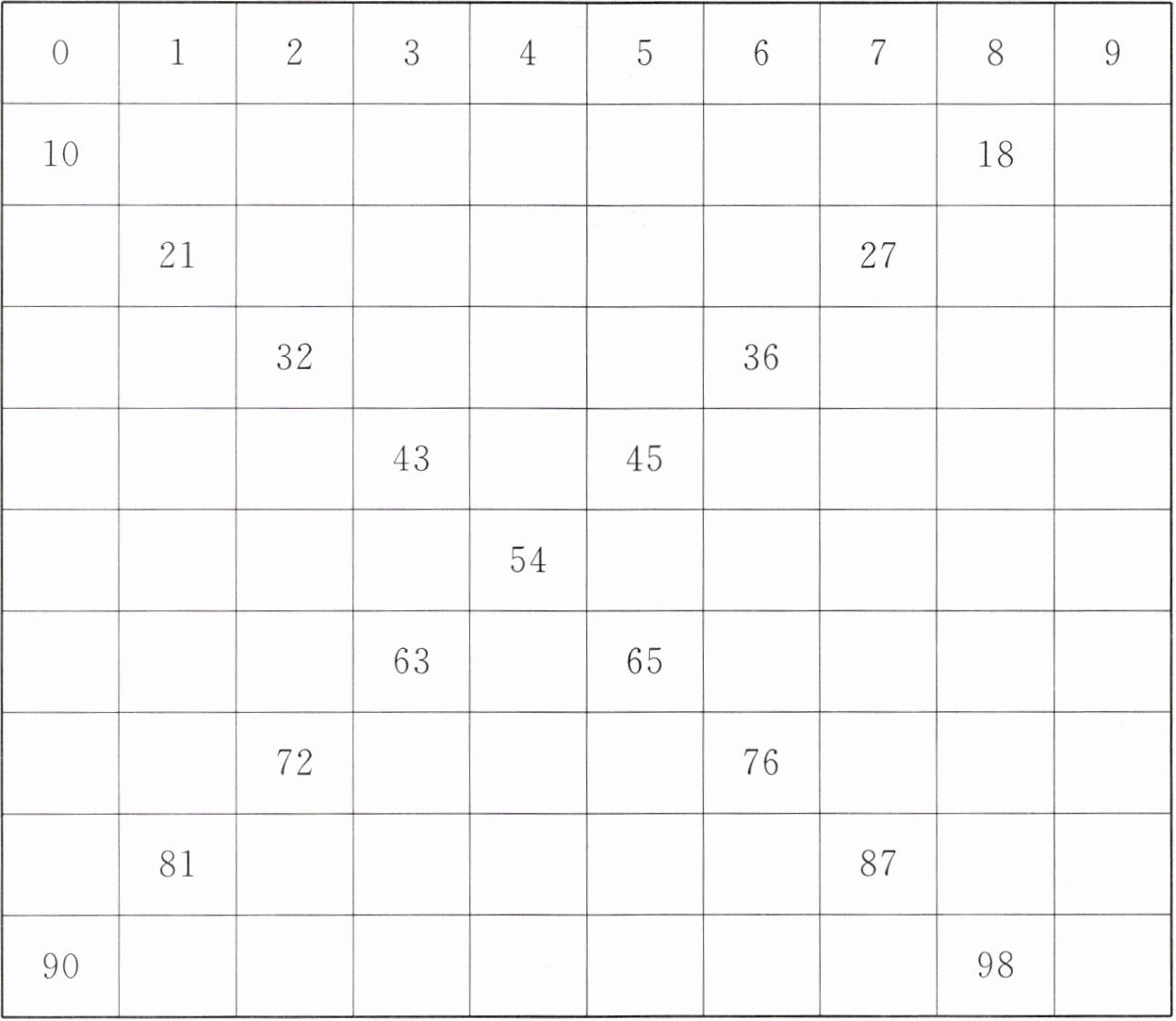 (1)先把表格补充完整。再给十位上是7的数涂上黄色,给个位上是7的数涂上红色。