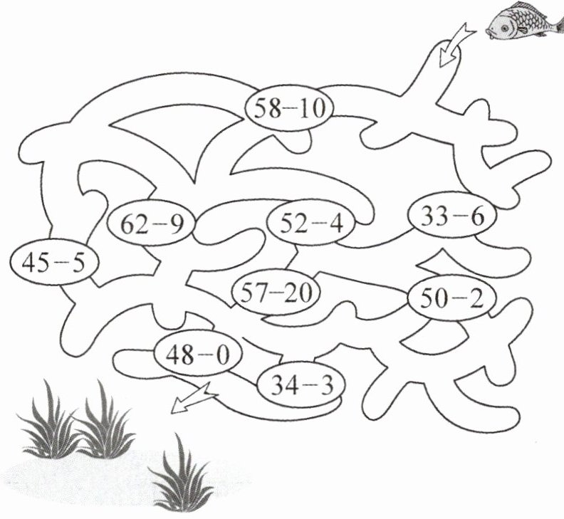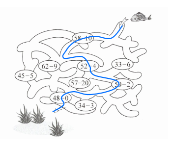 2. 金鱼必须走得数为48的路线才能回到河里,用蜡笔描绘出来。