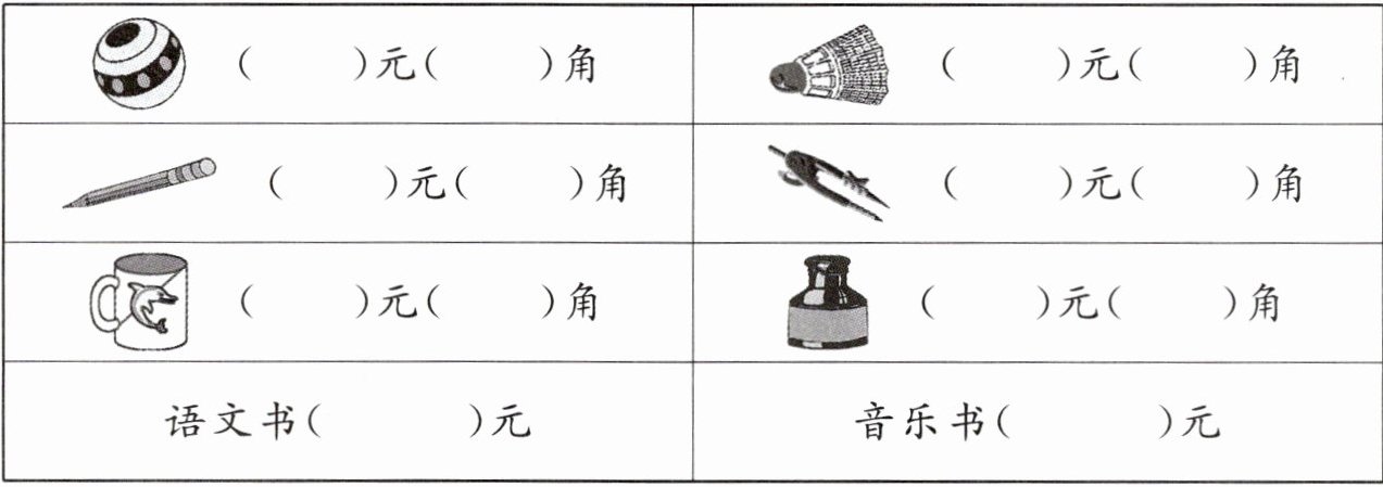 语文书(10)元;音乐书(8)元。(答案不唯一,需根据实际调查情况填写)