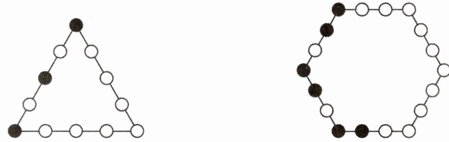 对于六边形图形:观察可知其黑球是每隔1个白球有2个黑球,依照该规律完成黑球的绘制。