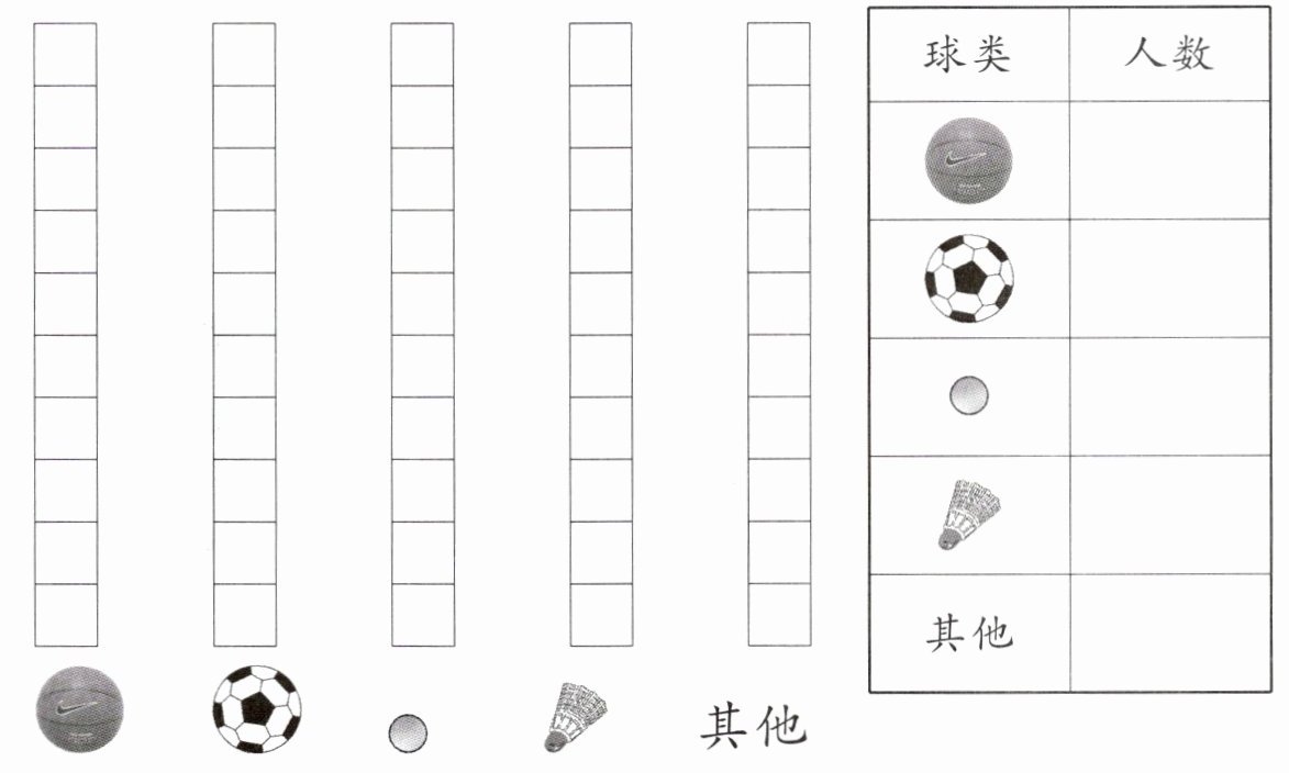 (2)提出问题:根据完成的图表,我们可以提出很多问题,例如:喜欢篮球的人数比喜欢足球的人数多多少?喜欢乒乓球的人数占总人数的几分之几?喜欢哪种球类运动的人数最少?以上问题仅供参考,你可以根据实际情况提出其他问题。