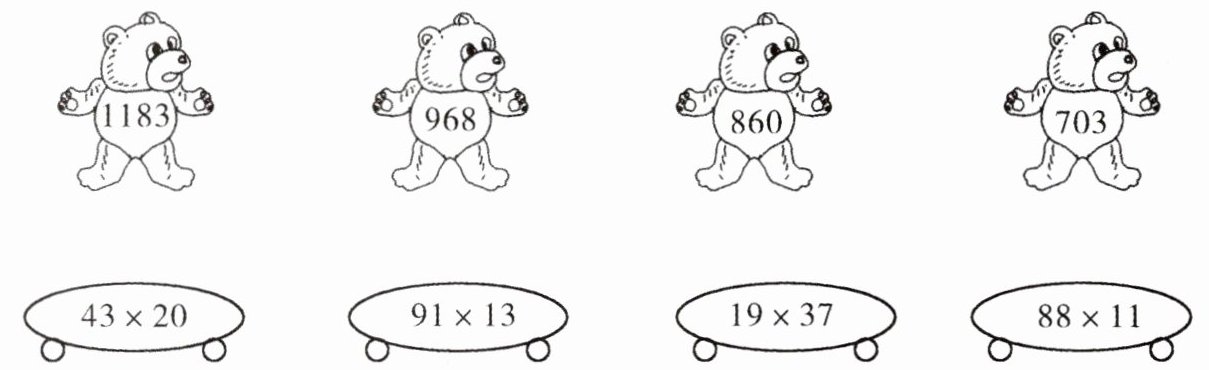 综上,连线结果为:$43×20$——$860$;$91×13$——$1183$;$19×37$——$703$;$88×11$——$968$。