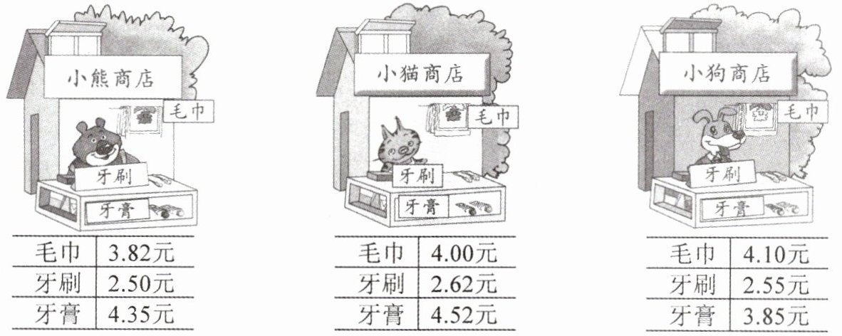 5. 到商店买物品,买毛巾到( )商店便宜,买牙刷到( )商店便宜,买牙膏到( )商店便宜。
