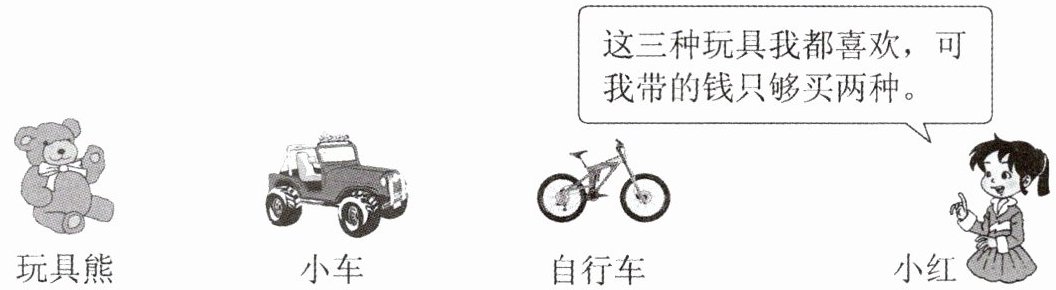 小红可能买玩具熊和小车;也可能买玩具熊和自行车;还可能买小车和自行车。