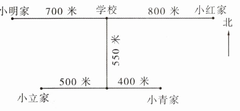 (1)学校在小明家的小明家700米学校800米小红家()面,在小红家的()面,在小立家的()面,在小青家的()面。